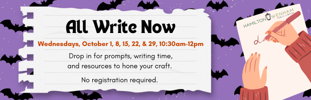 Join us for drop-in write-ins at the library writing group, five Wednesdays this October. Writers in all genres are welcome. Drop in to write along!