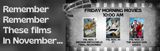 Join us for Friday library matinees of MISSION IMPOSSIBLE: FINAL RECKONING (11/7), F1 (11/14), and THE NAKED GUN (11/21). Water and movie snacks will be served.
