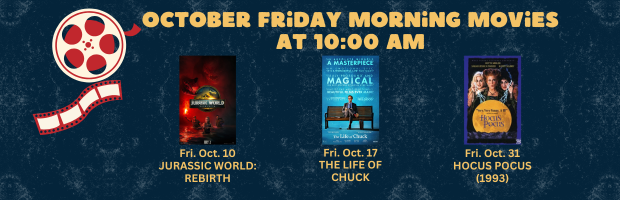 Join us for Friday library matinees of JURASSIC WORLD: REBIRTH (10/10), THE LIFE OF CHUCK (10/17), and HOCUS POCUS (10/31). Water and movie snacks will be served.