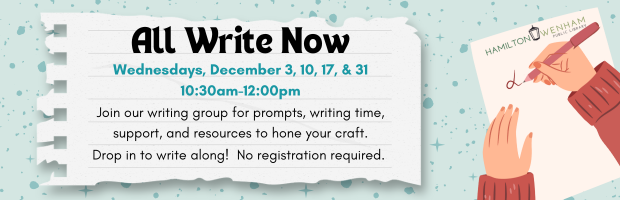 Join us for drop-in write-ins at the library writing group, four Wednesdays this December. Writers in all genres are welcome. Drop in to write along!