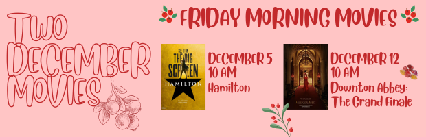 Join us for Friday library matinees of HAMILTON (12/5) and DOWNTON ABBEY: THE GRAND FINALE (12/12). Water will be available.