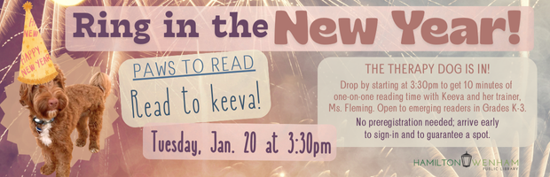 Come for one-on-one time reading to Keeva on a first come, first given basis. Sign in on arrival. For readers in grades K-3.