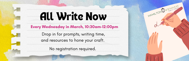 Join us for drop-in write-ins at the library writing group, four Wednesdays this March. Writers in all genres are welcome. Drop in to write along!