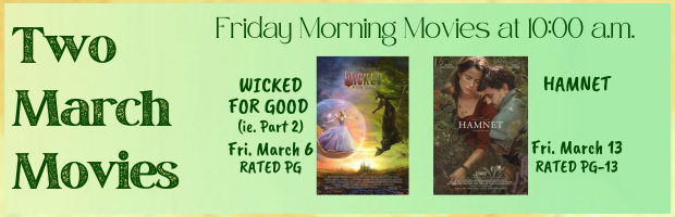Join us for Friday library matinees of WICKED FOR GOOD (ie. WICKED Part 2, 3/6) and HAMNET (3/13).