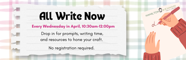 Join us for drop-in write-ins at the library writing group, four Wednesdays this April. Writers in all genres are welcome. Drop in to write along!