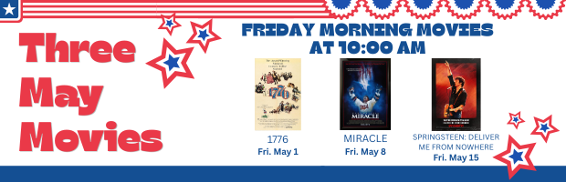 Join us for Friday library matinees of 1776 (5/1), MIRACLE (5/8), and SPRINGSTEEN: DELIVER ME FROM NOWHERE (5/15).